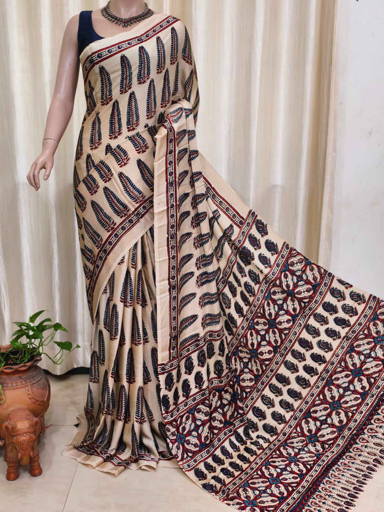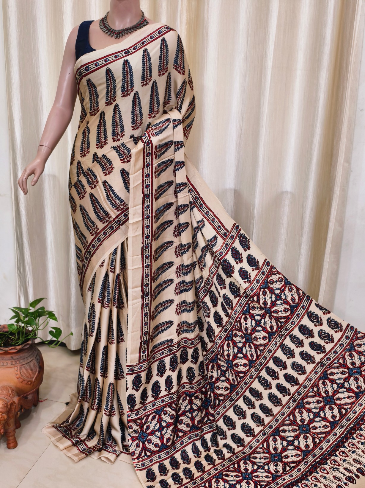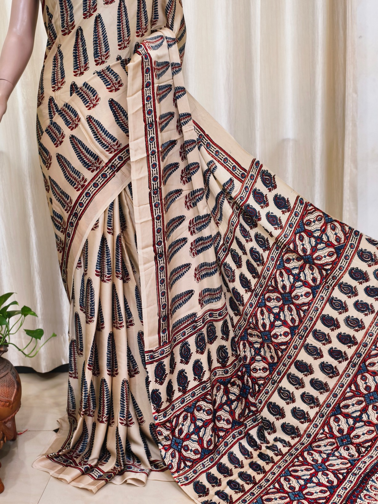 Saree : Modal Silk Ajrakh Handblock Prints Saree.