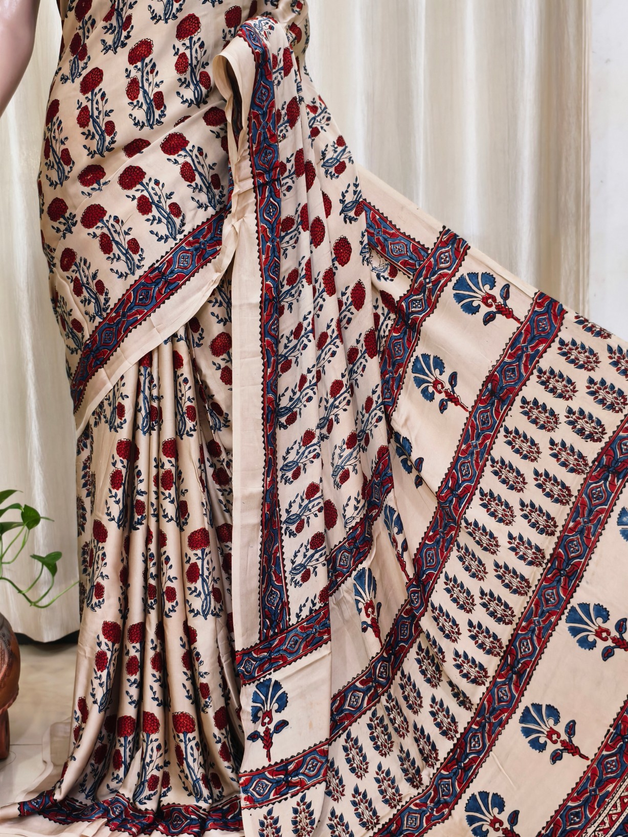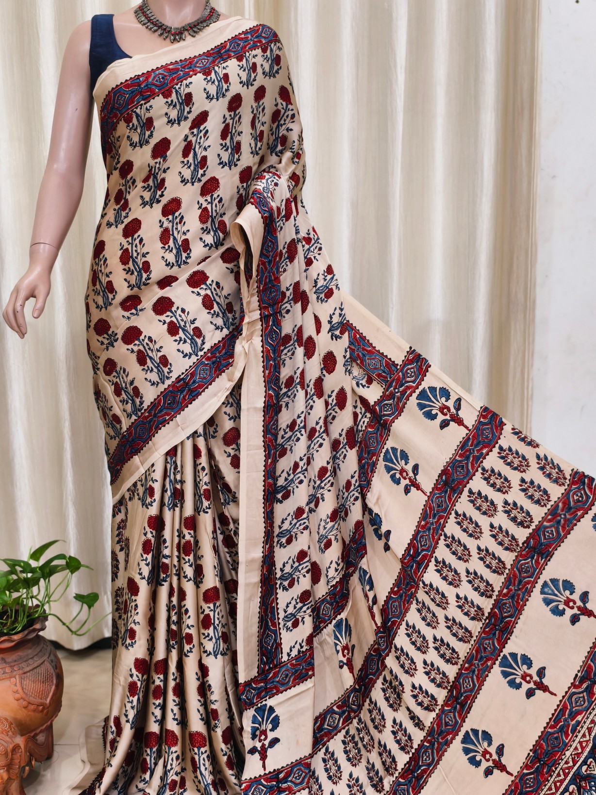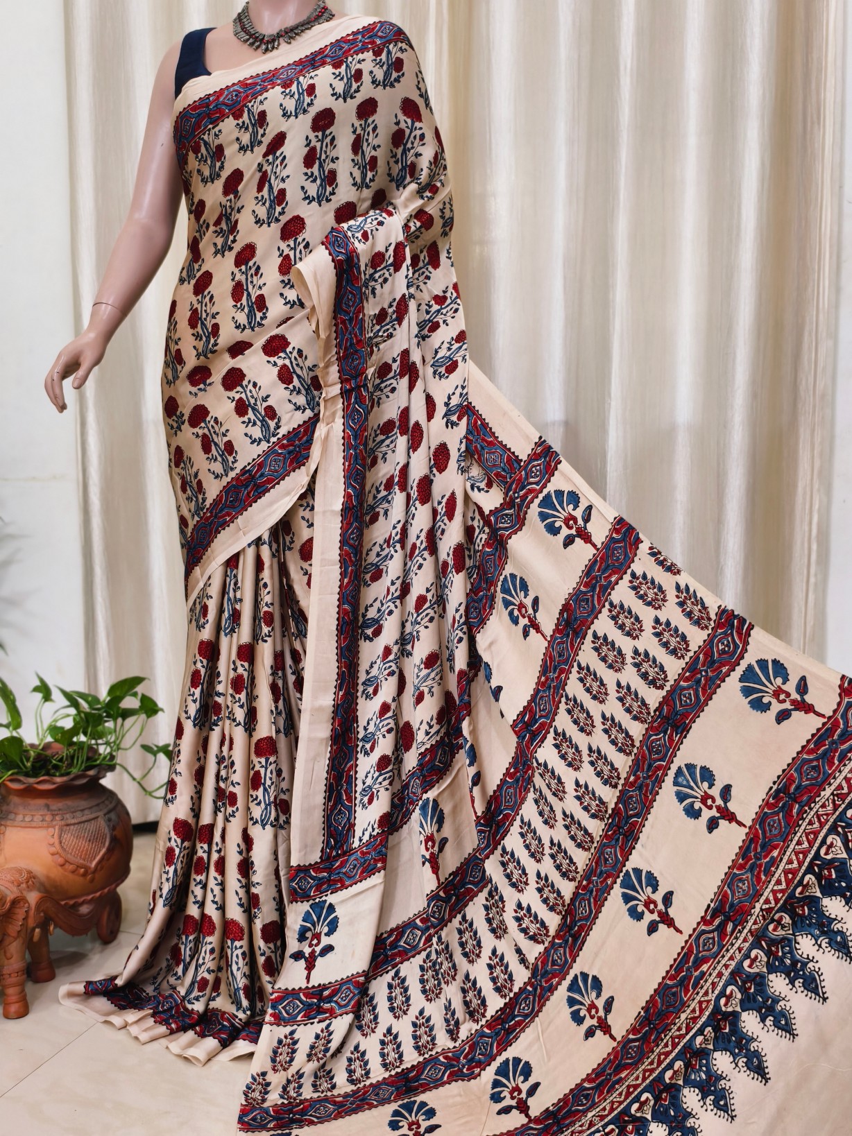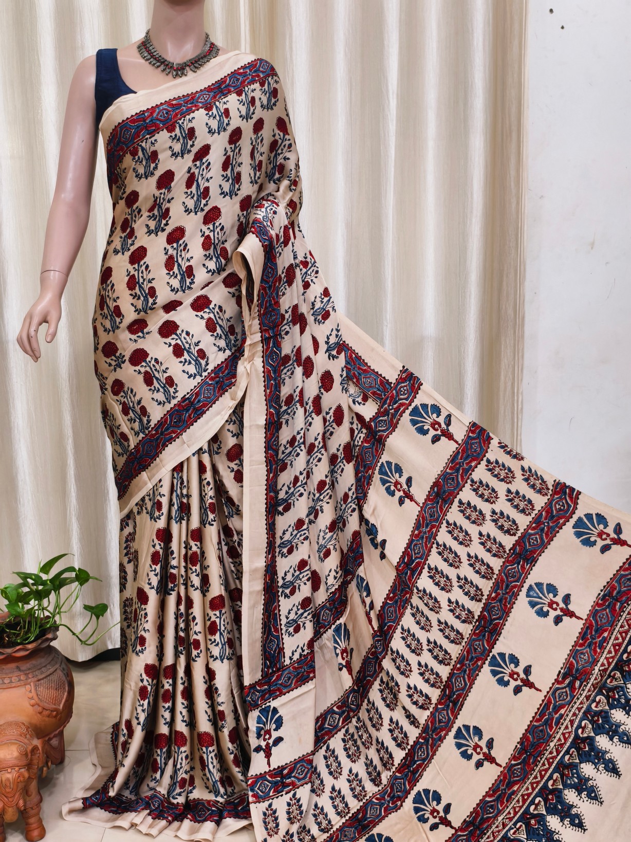 Saree : Modal Silk Ajrakh Handblock Prints Saree.